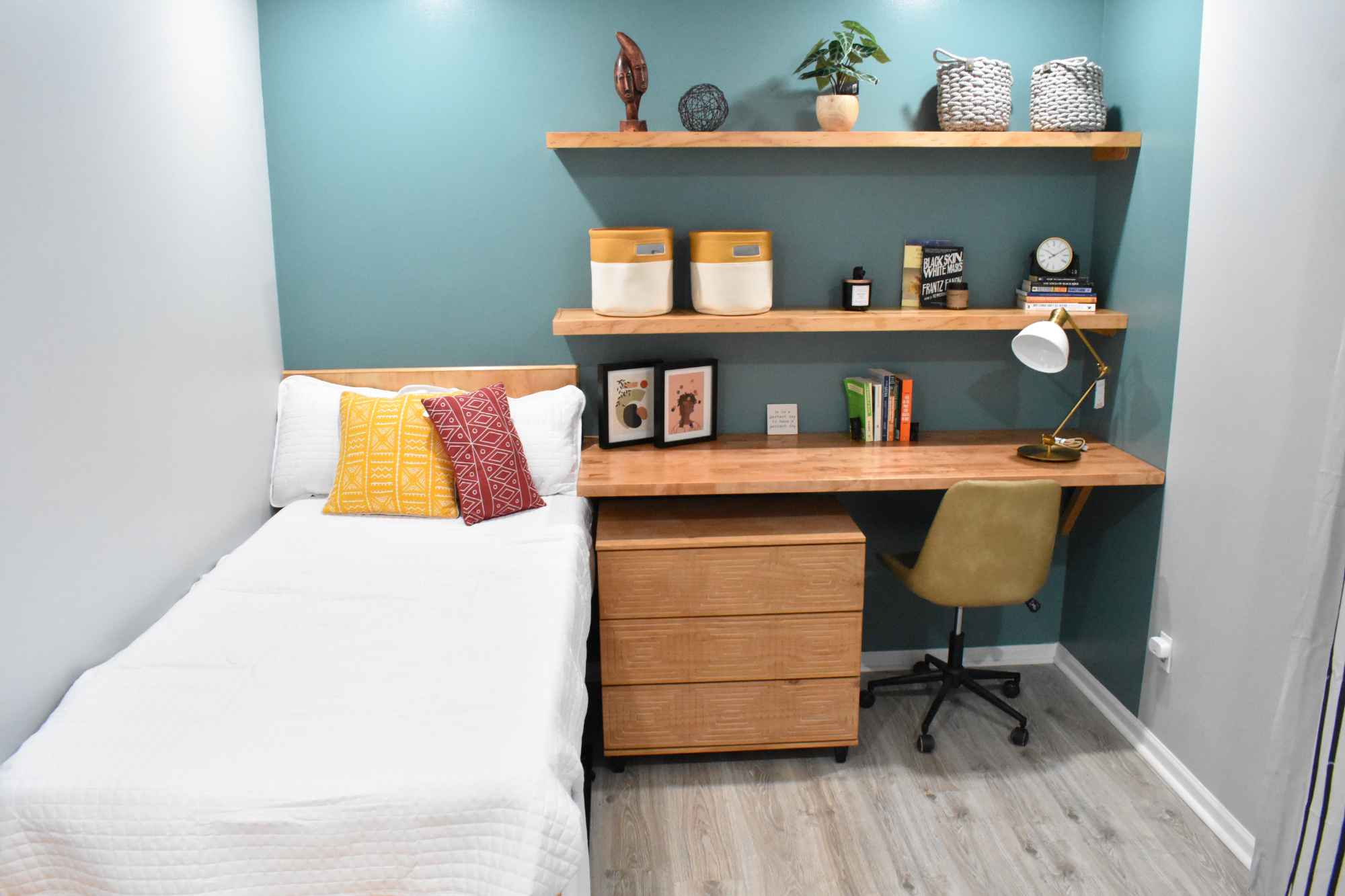 *STUDENT HOUSING ONLY* This room comes with all of the essentials, making great use of the space with a built in bed, small bench, desk and shelves. It has two windows, both with black out curtains and blinds, and with one facing the front of the home. A small dresser and a trundle unit for easy beneath-the-bed storage is also included. There is a lounge area, study/huddle room, private deck and fenced in back yard.