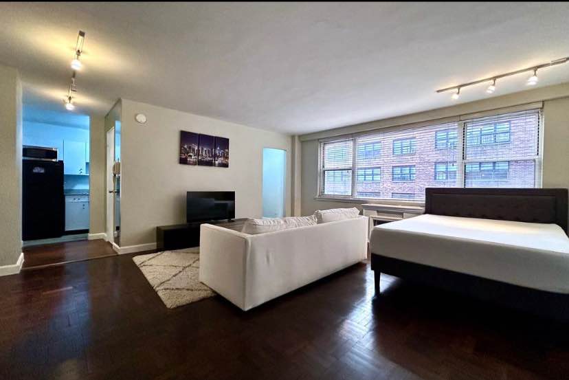 No fee; large studio apartment; fully furnished; elevator building with 24-hour doorman; newly renovated bathroom; large closets; laundry in building. This well-maintained studio apartment faces north with large windows and great light. The space is pin-drop quiet, clean and bright. All furniture is included with the..